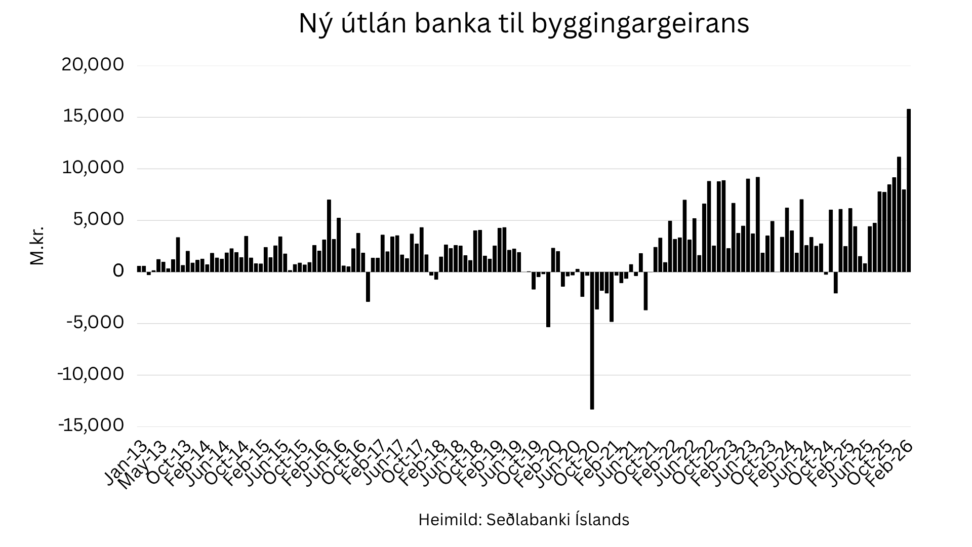 Það hvernig fjármagnskostnaður hleðst ofan á skuldir byggingarfélaga birtist líklega í nýjum tölum Seðlabankans um útlán innlánastofnana. Þær sýna útlán til atvinnugreinarinnar aukast um 15,8 milljarða í marsmánuði, sem er mesta aukningin í einum mánuði sem mælst hefur eins langt aftur og tölurnar ná, eða til ársbyrjunar 2013.