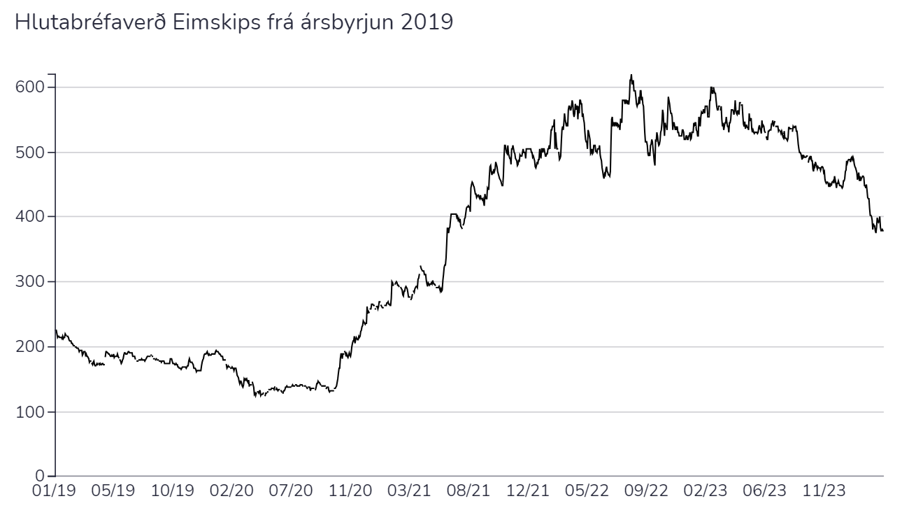Samhliða lækkun flutningsgjalda, sem náðu methæðum í heimsfaraldrinum, og eftir því sem merki um minnkandi efnahagsumsvif komu betur í ljós hefur hlutabréfaverð Eimskips gefið eftir. Þessi þróun ágerðist í byrjun febrúar þegar danski skiparisinn Maersk birti uppgjör, sem sýndi taprekstur á síðasta fjórðungi ársins 2023, stöðvaði endurkaup á eigin bréfum og málaði heldur dökka mynd af rekstrarumhverfinu á þessu ári.