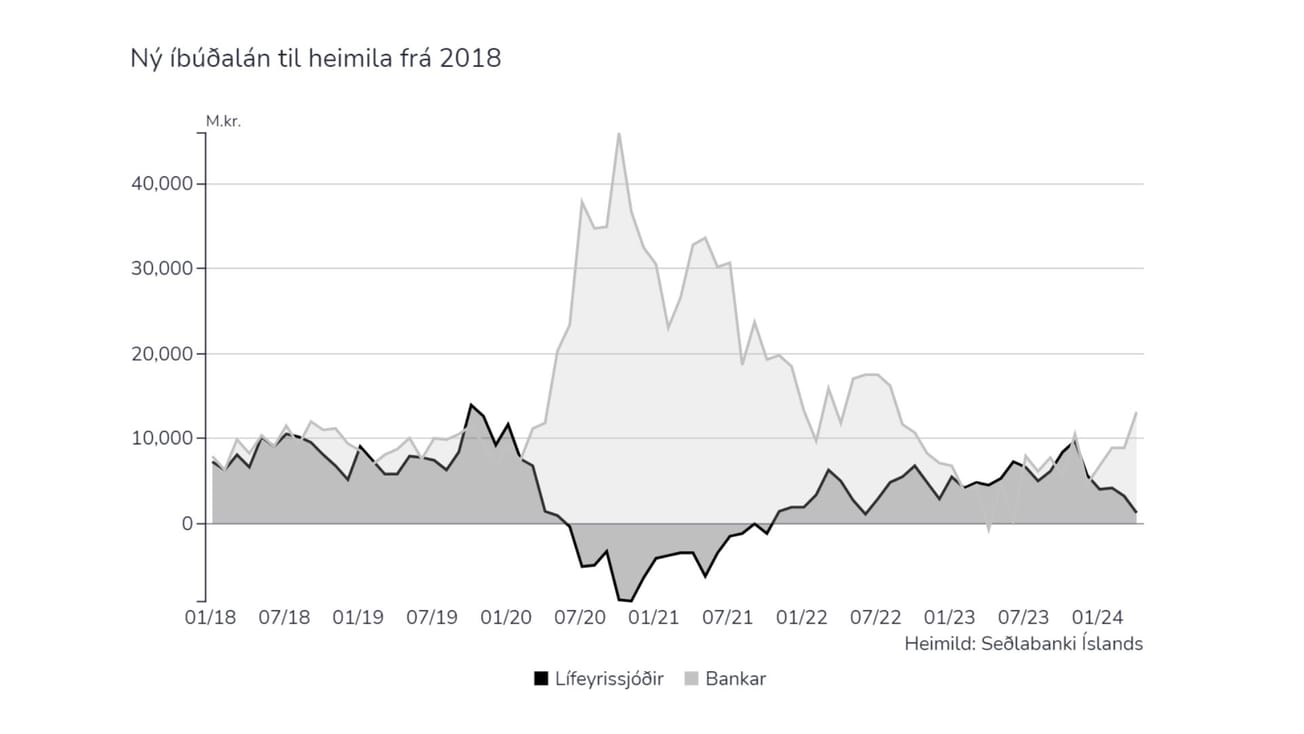 Þetta er skörp breyting frá því í nóvember þegar bankakerfið og lífeyrissjóðakerfið voru með jafna hlutdeild, um 10 milljarða hvort, og leita þarf aftur til júlí 2022 til að finna meiri mun en nú í apríl.