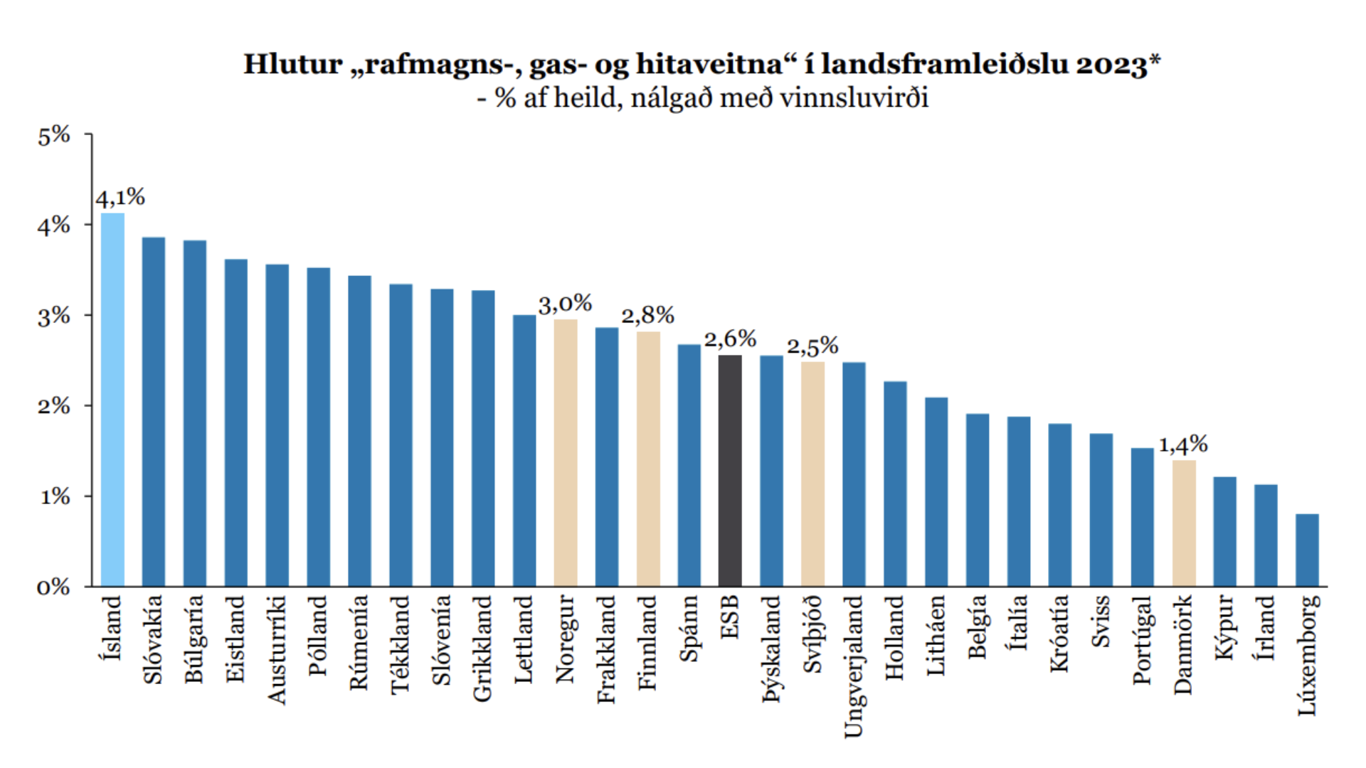 Sérstaða Íslands birtist með margvíslegum hætti í opinberum tölum, eins og fram kemur í greiningunni sem var kynnt á Nýársfundi Orkuklasans í fyrradag. Hér er hlutfall endurnýjanlegra orkugjafa mun hærra en annars staðar, eða um 85 prósent af heildarorkunotkun samanborið við 52 prósent hjá Noregi sem er í öðru sæti. Og hvergi í Evrópu er orkugeirinn jafnstór hluti af vergri landsframleiðslu og á Íslandi, alls 4,1 prósent árið 2023.
