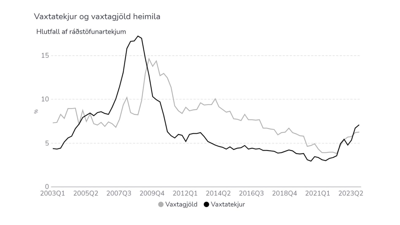 Vaxtatekjur heimilanna hækkuðu örum skrefum á seinni hluta síðasta árs og fóru töluvert fram úr vaxtagjöldum. Þetta kemur fram í Peningamálum, sem Seðlabanki Íslands birti samhliða vaxtaákvörðun fyrr í vikunni.